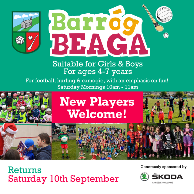 The Club have decided on the return date of our Barróg Beaga. We will start back on Saturday 10th September at 10am. Barróg Beaga is for boys and girls aged 4-7 years old, born 2016-2018. All are welcome, new players and ones who have been with us previously.
